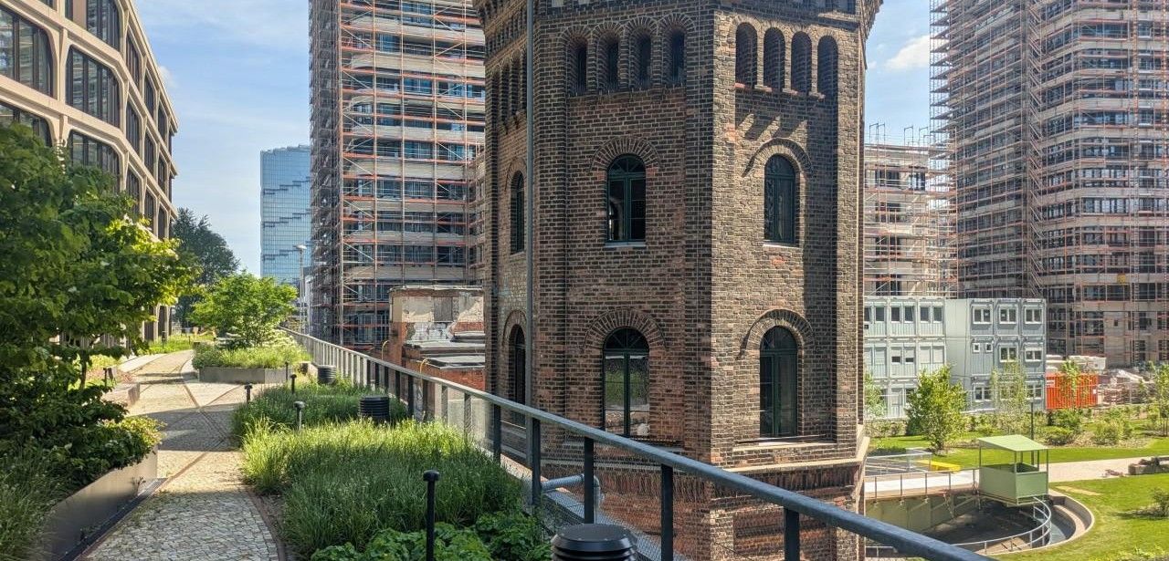 Auf dem 7800 Quadratmeter großen Grundstück des Berliner Postbahnhofs wurde ein fünfgliedriges Gebäudeensemble realisiert, das historische Viaduktbögen aufgreift. Smart Flow Control steuert über statische Drosseln die Retentionsdächer, während Kapillarbrücken eine gleichmäßige Wasserverteilung gewährleisten. Umfangreiche Dach- und Fassadenbegrünung puffert Niederschlagsereignisse und verbessert das Umfeldklima. Ziel des Konzepts ist die Reduktion des Kanalabwassers, die Unterstützung der Biodiversität und die Wahrung des industriellen Charakters vor Ort. Das Vorhaben kombiniert Innovation mit denkmalpflegerischer Verantwortung.